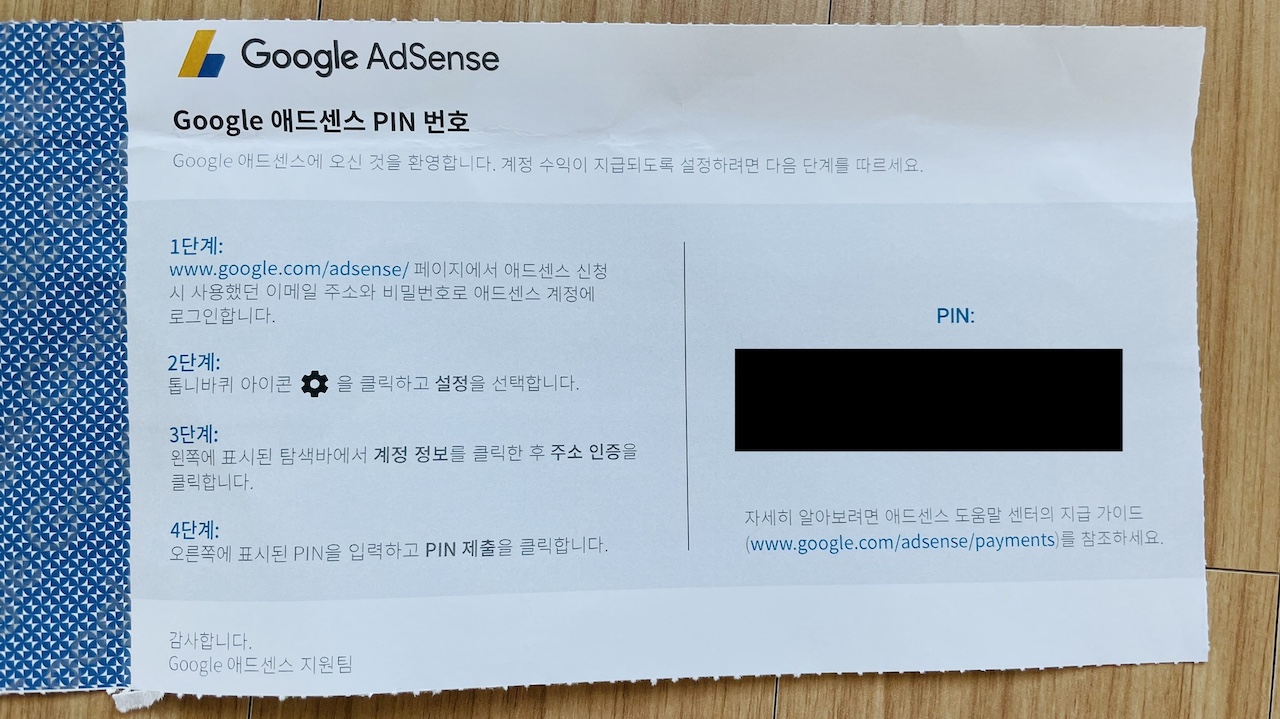 엽서의 위, 아래와 한 쪽 옆 부분을 뜯으면 안 쪽에 이렇게 애드센스 핀번호가 적혀 있습니다. 이제 애드센스 사이트에서 입력하면 됩니다.