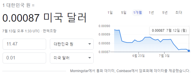 구글 애드센스 승인을 받은 후에는 광고 수익이 차곡차곡 쌓일 것입니다. 저는 21년 6월부터 제대로 시작을 했는데, 하루에 0.01달러가 들어온 적도 많네요. 21년 7월 13일 기준으로 1달러는 1147.1원입니다. 계산을 하면