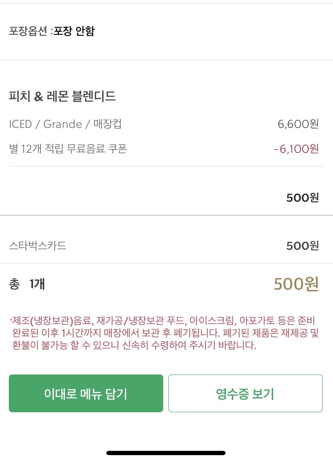 예를 들어 피치, 레몬 블렌디드 Tall Size는 6100원입니다. 그런데 Grande 사이즈로 주문하면 이렇게 Tall Size 기준 6100원이 할인되어 나머지 금액만 청구됩니다.