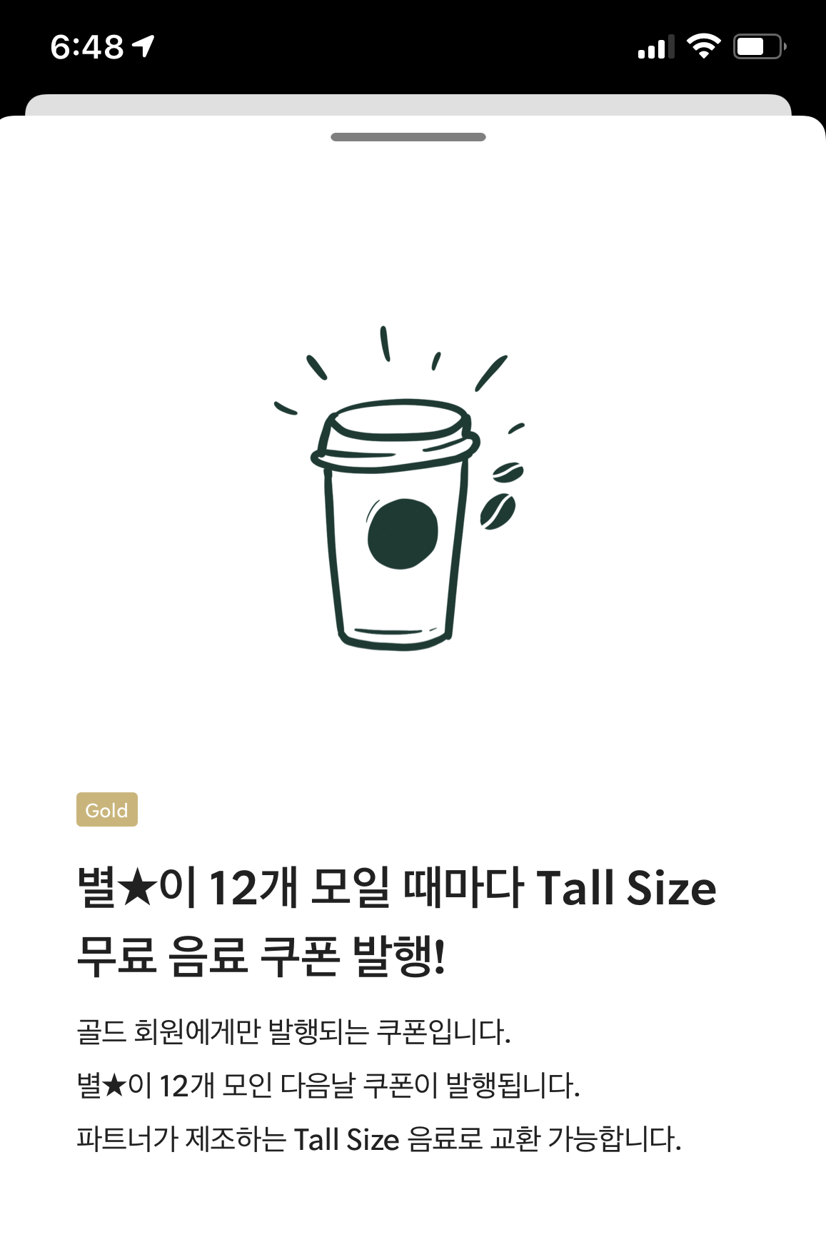 별을 모으면 그린에서 골드 등급으로 바뀝니다. 골드 등급에서는 별 12개를 모으면 무료쿠폰 1개를 줍니다.