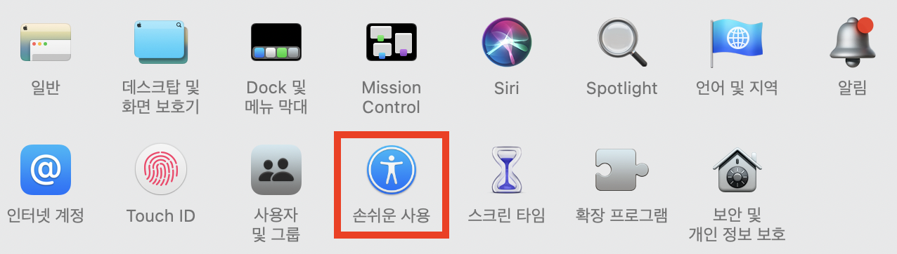 그 다음 "손쉬운 사용"으로 들어갑니다. 시스템 환경설정 중 트랙패드 메뉴에 가도 "세 손가락 드래그" 기능을 설정할 수 없습니다.