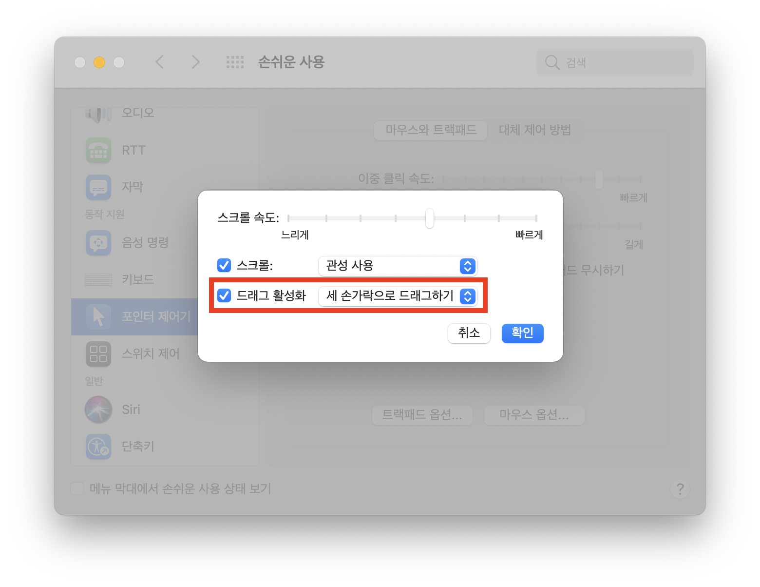 그 다음 "드래그 활성화"에 체크하고, 드롭다운 메뉴에서 "세 손가락으로 드래그하기"를 선택한 후 확인을 누르면 끝입니다.