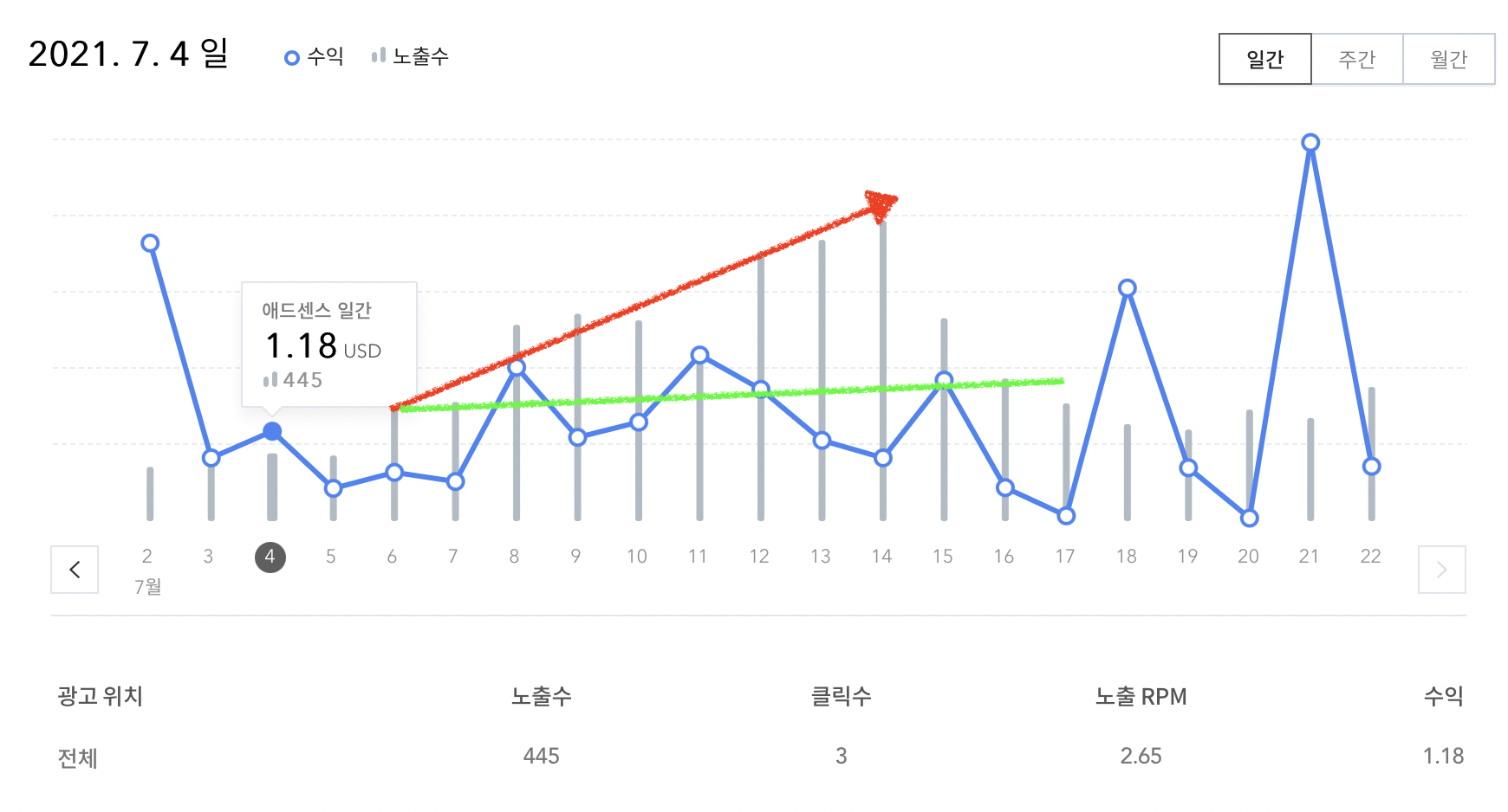 위 방문자수 그래프와 비교해서 보시면, 7월 8일에 방문자수가 많이 늘었는데, 광고 노출수도 비례하여 많이 늘었습니다. 그런데!