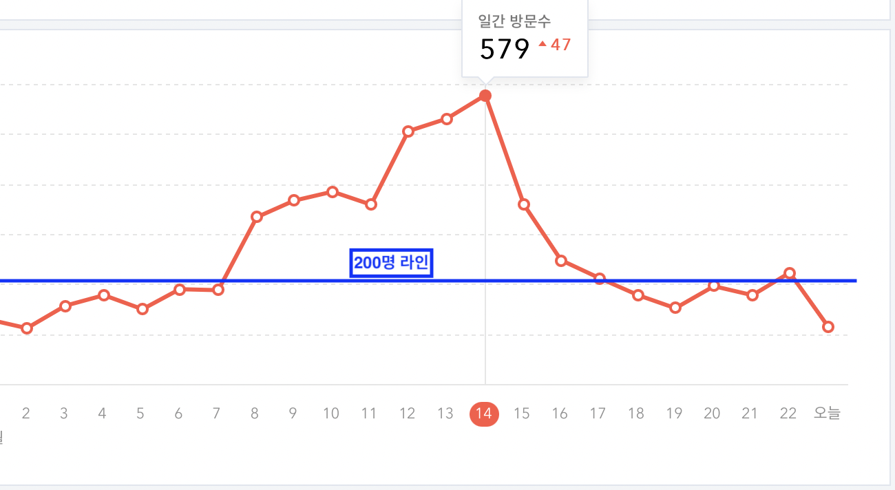 그러다가 3일간 500명대를 유지하고 최고 579명까지 찍었네요. 이후 다시 300명대로 내려오더니 200명대에서 다시 정상적인 100 후반대로 복귀를 했습니다. 이 그래프를 보니 마치 미국 중소형 성장주 차트를 보는 듯하군요.