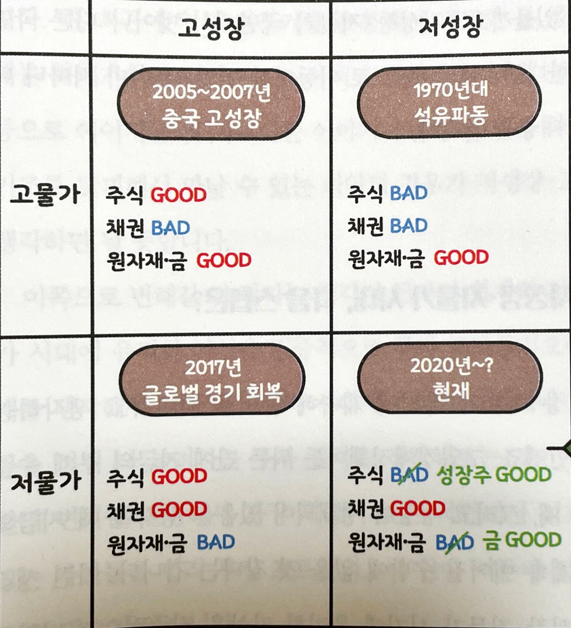 주식을 볼 때 매우매우 중요한 요소는 '성장'과 '금리(물가)'입니다. 이 두 가지를 축으로 나눠보면 다음 그림과 같습니다.