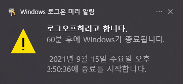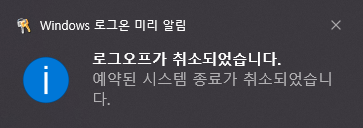 이렇게 윈도우 화면 오른쪽 밑에 다시 로그오프가 취소되었다고 메시지가 뜹니다.