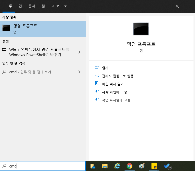 혹시 검색 명령어 입력 칸이 없으면 '시작' 버튼을 마우스 오른쪽 클릭하여 실행을 클릭하거나, '윈도우 키+R'을 눌러 'cmd'를 입력해도 됩니다.