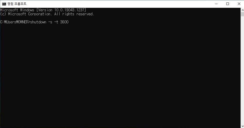 을 입력합니다. shutdown 다음에는 글자 사이에 한 칸을 띄웁니다. 시간(초)은 초단위로 계산해서 입력합니다. 예를 들어 1시간 뒤에 종료하고 싶으면 1시간=60분=3600초 이니 3600을 입력해주면 됩니다.