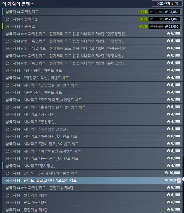 삼국지14 오리지널+파워업키트+시즌패스1까지 묶어서 디럭스 에디션으로 판매하고 있는데 가격이 110,900원입니다.