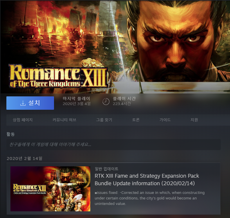저는 삼국지13도 파워업키트까지 구매하여 플레이했습니다. 13도 무려 223.4시간을 플레이했네요.