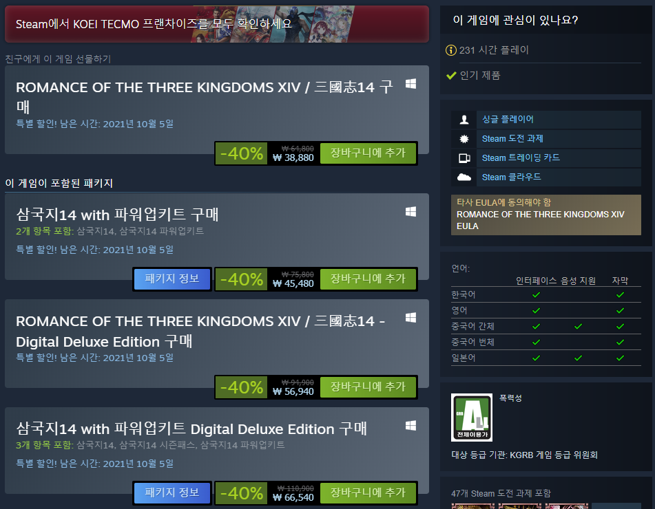 오리지널이 38,800원, 파워업키트는 45,480원, 디럭스 에디션은 66,540원입니다. 혹시 삼국지14를 하고는 싶었는데 너무 비싸고 이미 시간도 지나서 망설였던 분들이라면 달리세요. 한 번 마음에 들어온 이상, 언젠가는 하고 싶어지는 때가 올 것입니다. 그 때에 정가를 주고 플레이하려면 지금 이 순간이 아쉬워질 때가 올 것입니다.