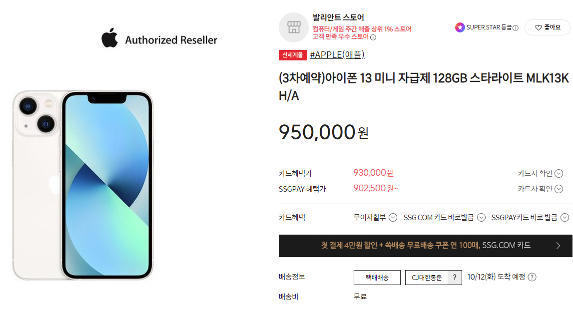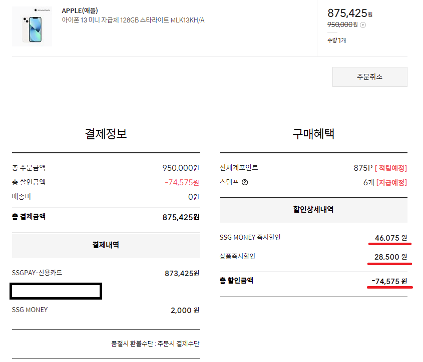 드디어 밤 12시가 되고 떨리는 마음으로 쿠팡에 접속했으나 페이지 오류가 바로 뜨더군요. 처음부터 원하는 상세 페이지(제 경우에는 미니)를 열어두고 새로고침(F5)를 눌러야 했으나 바보같이 13사전예약 페이지를 새로고침하여 오류만 뜨더라구요. 몇 번 누르다 쿠팡은 제끼고 바로 SSG로 시도했는데 여기는 물건이 있더라구요. 자세한 내용을 확인하지도 않고 일단 결제하자는 마음으로 13미니 128GB 스타라이트로 주문을 했습니다. 카드할인 어쩌고 있었지만 일단 할인총액을 봐서 제법 할인이 되길래 결제부터 했습니다.