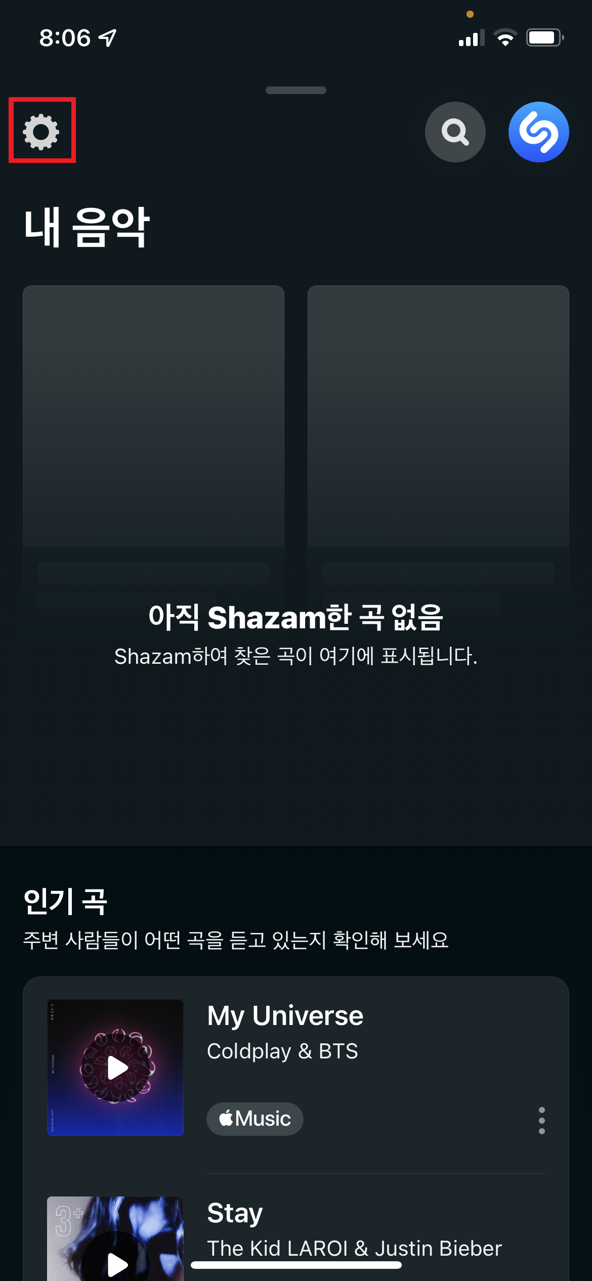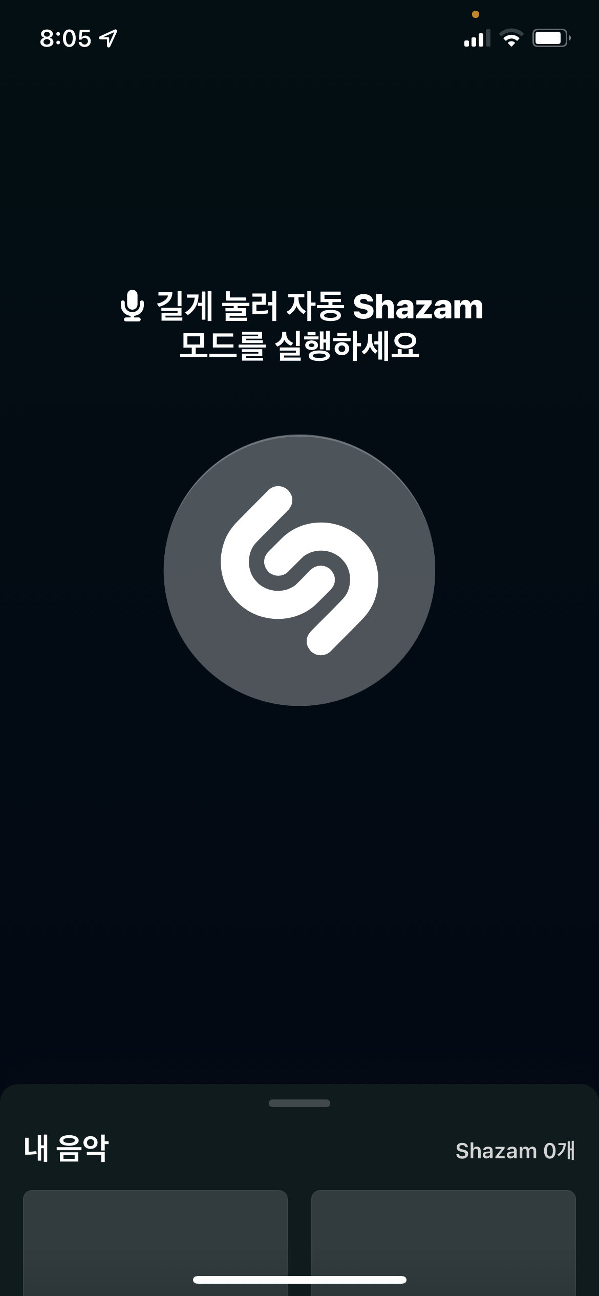 오늘은 샤잠앱(흘러나오는 음악을 검색하여 알려주는 앱)에서 애플뮤직을 무료로 2개월 이용할 수 있는 방법을 알아보겠습니다. 먼저 샤잠앱을 다운받으신 후 실행시킵니다. 그 후 아래에 있는 바를 위로 올립니다.