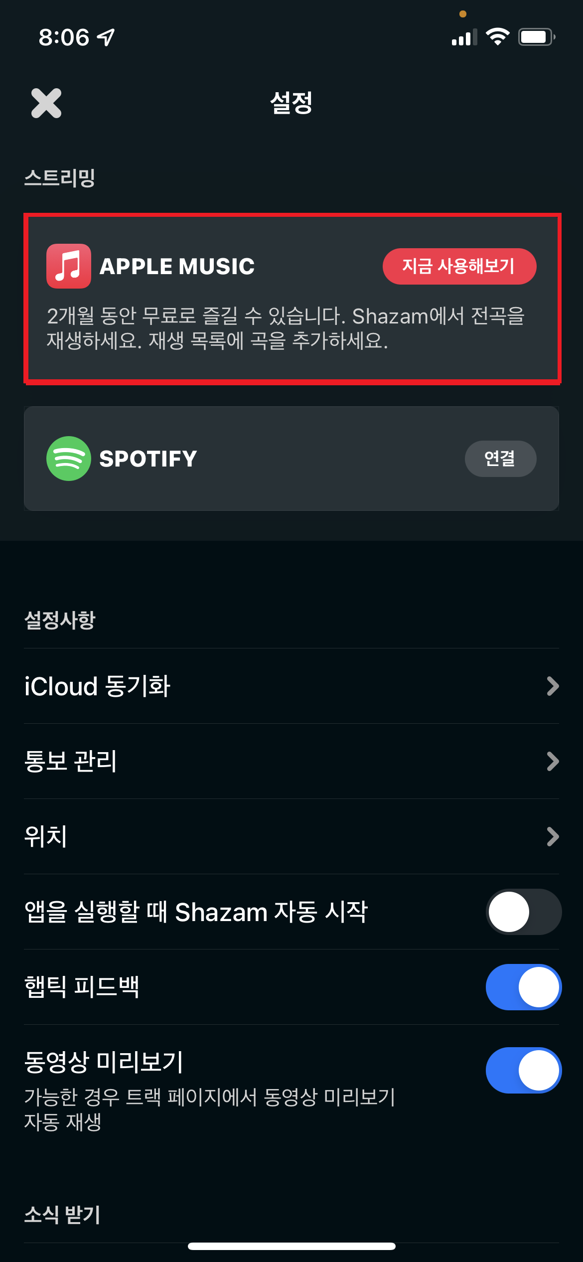 설정 기능에 들어가면 이렇게 애플뮤직 2개월 지금 사용해보기 기능이 나타납니다.