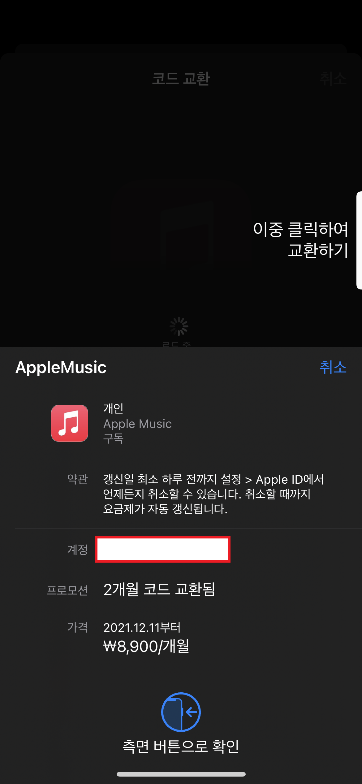 결제 하고 나면 이렇게 2개월 무료 코드가 입력 완료되었고, 2개월 동안 애플뮤직을 무료로 사용할 수 있게 됩니다.