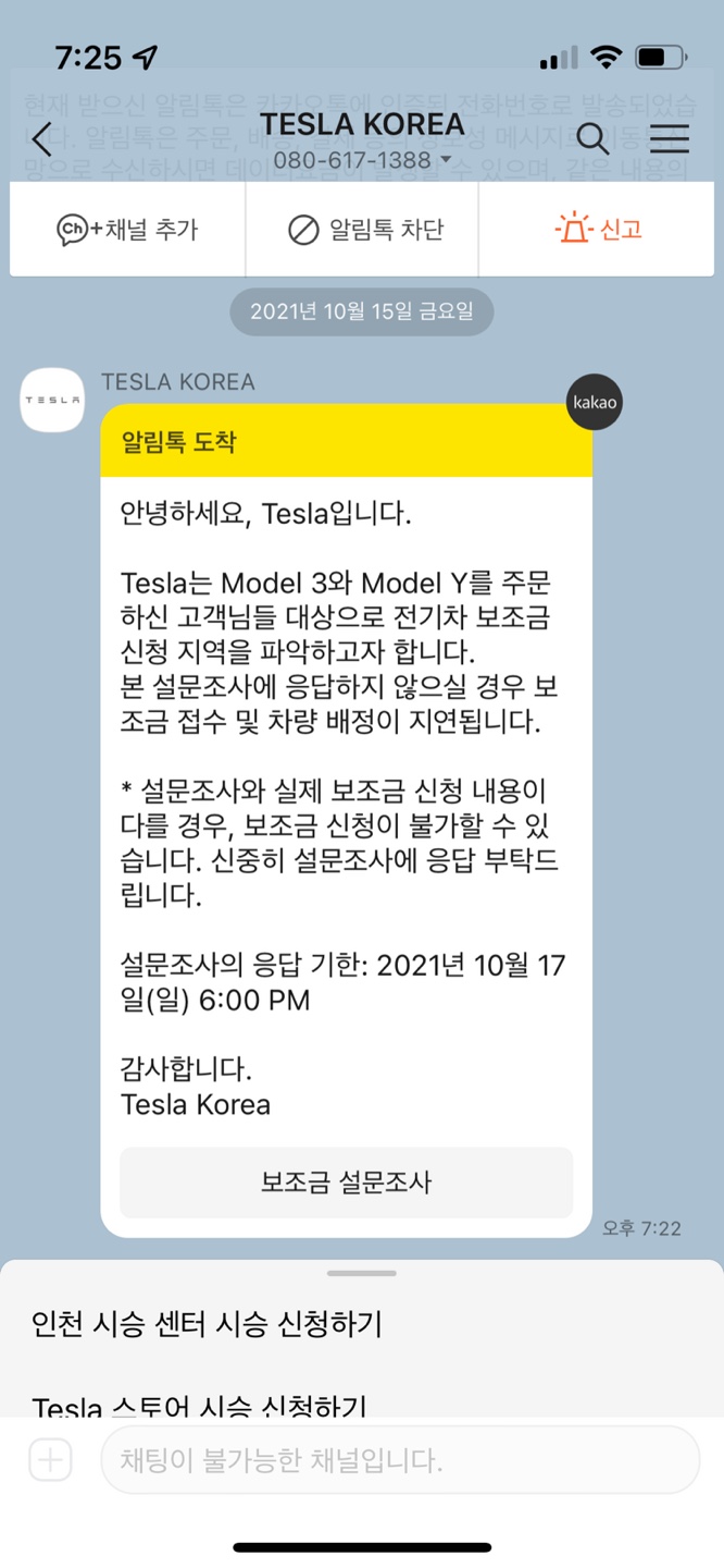 그러다가 지난 21년 10월 15일(금)에 테슬라에서 카톡이 왔습니다. 주문 신청 후에 처음으로 연락을 받은 것이네요.