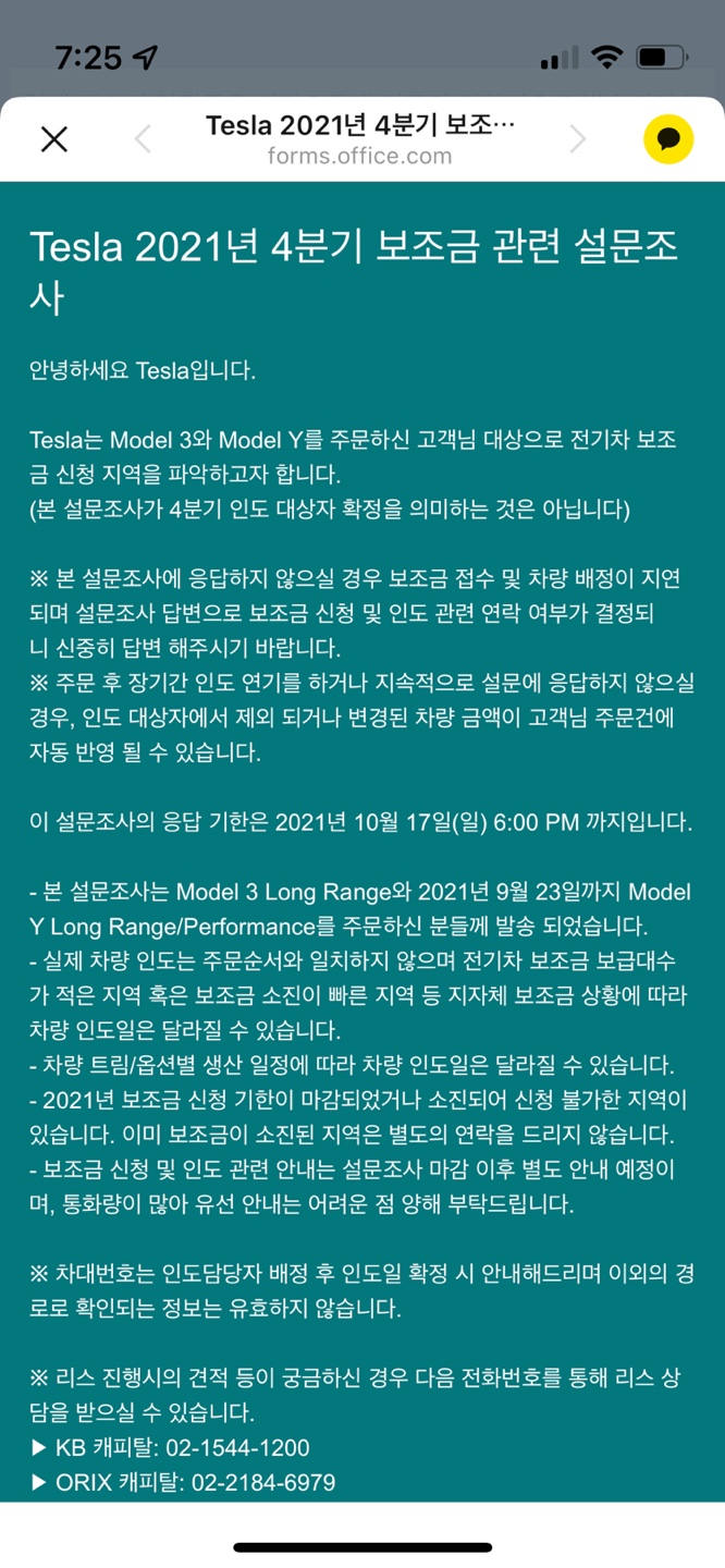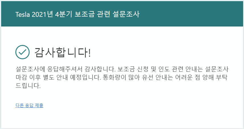 테슬라(tesla) 21년 4분기 보조금 관련 설문조사 문자를 받았네요.
