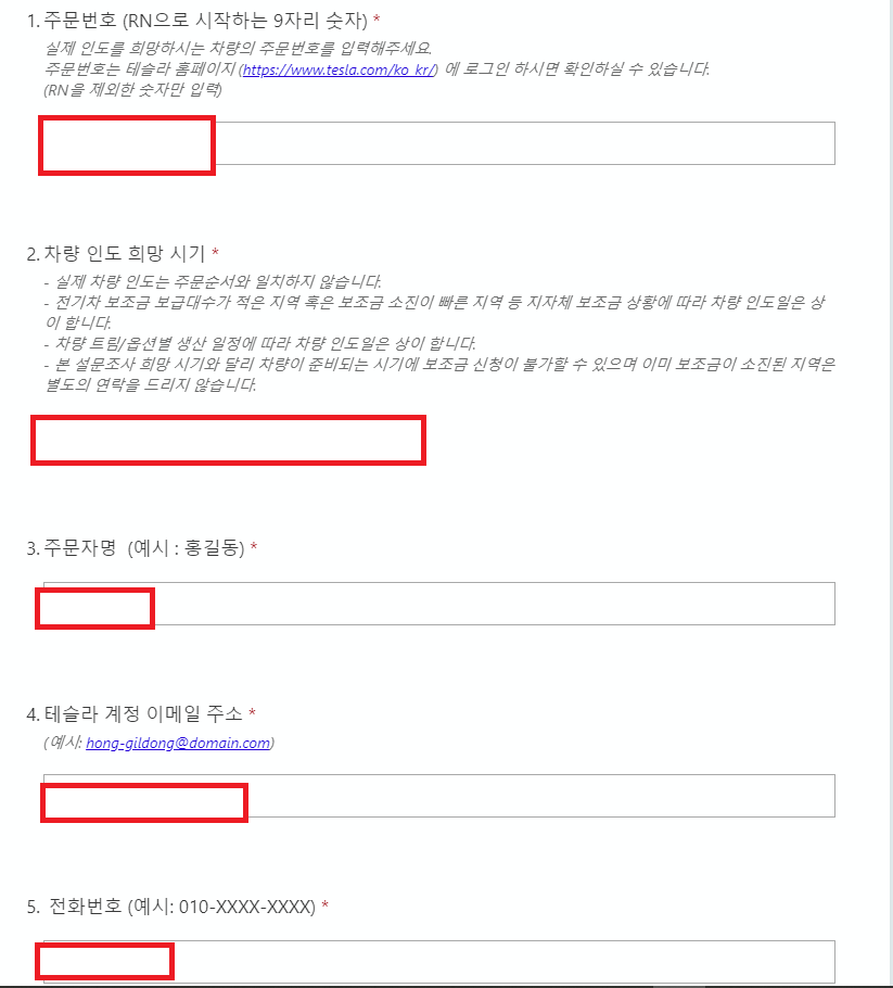 주문번호, 차량 인도 희망 시기, 주문자명, 테슬라 계정 이메일 주소, 전화번호, 보조금 신청 지역, 보조금 소진 시 타지역 혹은 리스 의망 여부, 보조금 신청 유형, 보조금 우선 순위 대상 여부