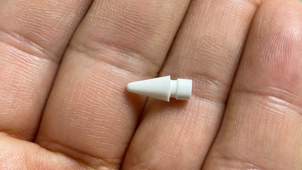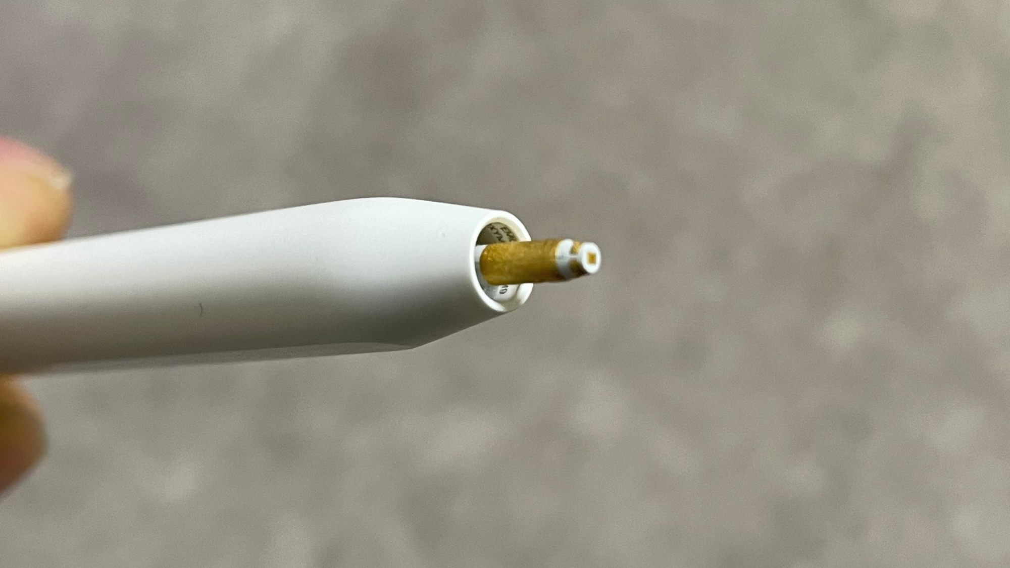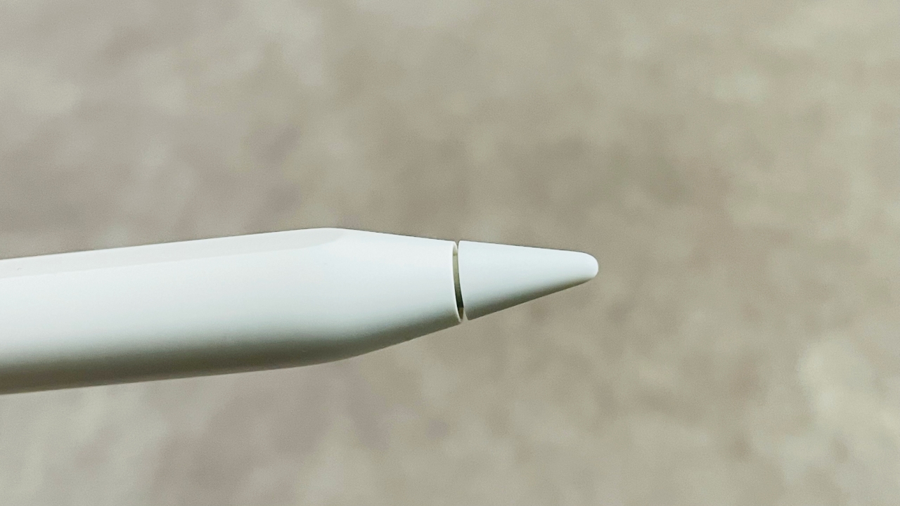 서론이 길었네요. 애플펜슬 2세대를 사용하다 보니 어느 순간 펜촉이 옆으로 기울어져 있다는 느낌이 들었습니다. 안에 있는 쇠가 휘었나 싶어 확인해보니 그렇지 않았습니다. 그래서 자세히 살펴보니 이렇게 펜촉에 금이 가 있었습니다.