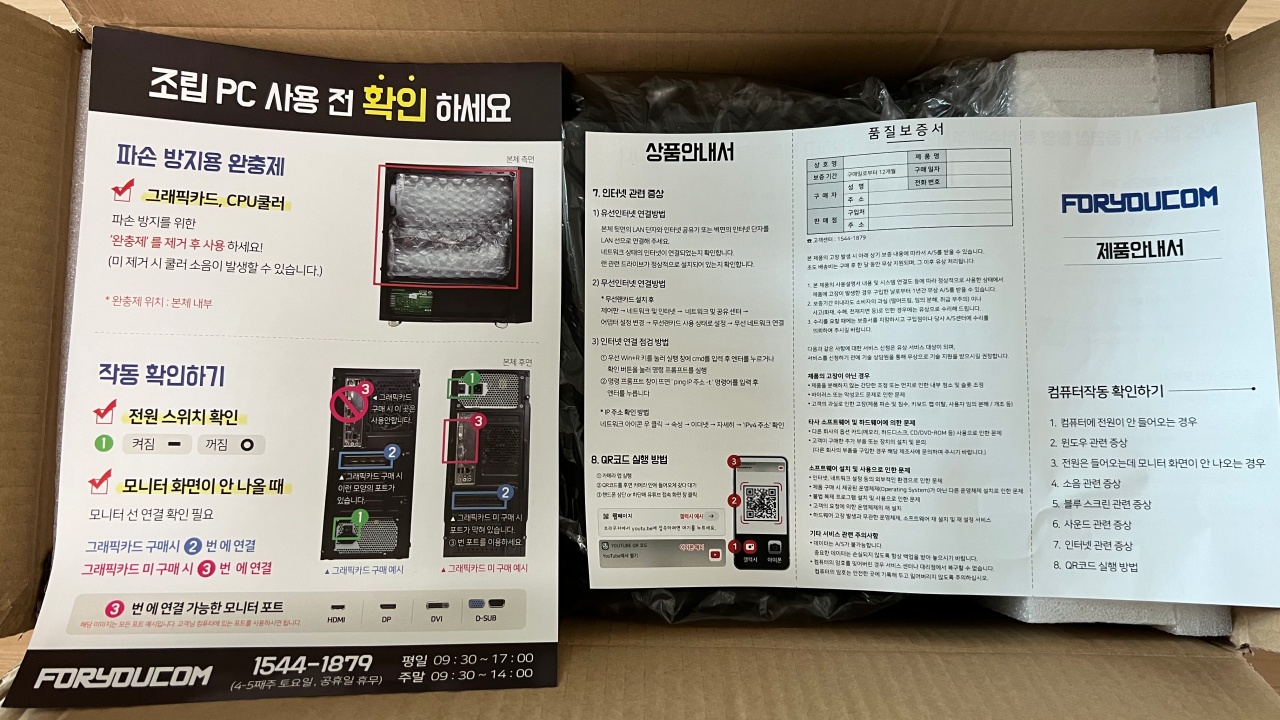주문을 하고, 하루 정도 뒤에 조립한다고 업체에서 전화가 왔고, 부품이 없는 게 있어서 메인보드와 파워를 업그레이드 된 걸로 보내준다고 친절하게 설명을 해주었습니다. 전화 통화 잠시 후 발송이 시작되어 다음날 제품을 받았습니다.