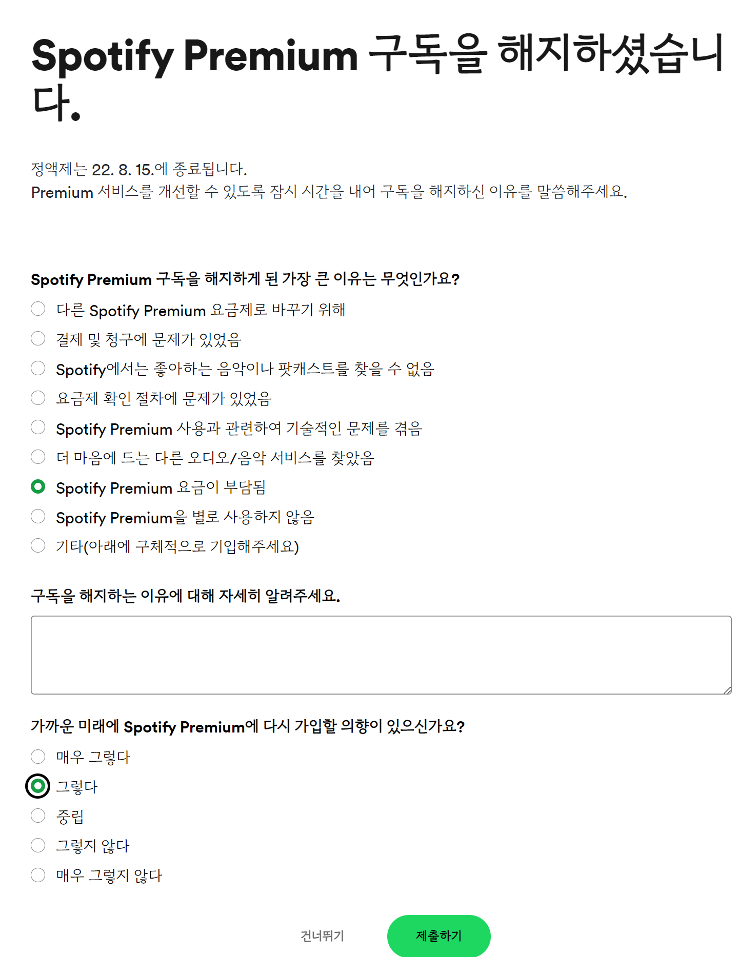 누르면 '스포티파이 프리미엄 구독을 해지하셨습니다.'라는 문구가 나옵니다. 서비스 개선을 위해 구독 해지 이유를 묻습니다. 친절하게 체크를 해줍니다.