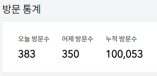 22년 7월 28일 오후 9시 47분 기준 하루 방문자가 383명 정도이고, 누적 10만 53명이었습니다.