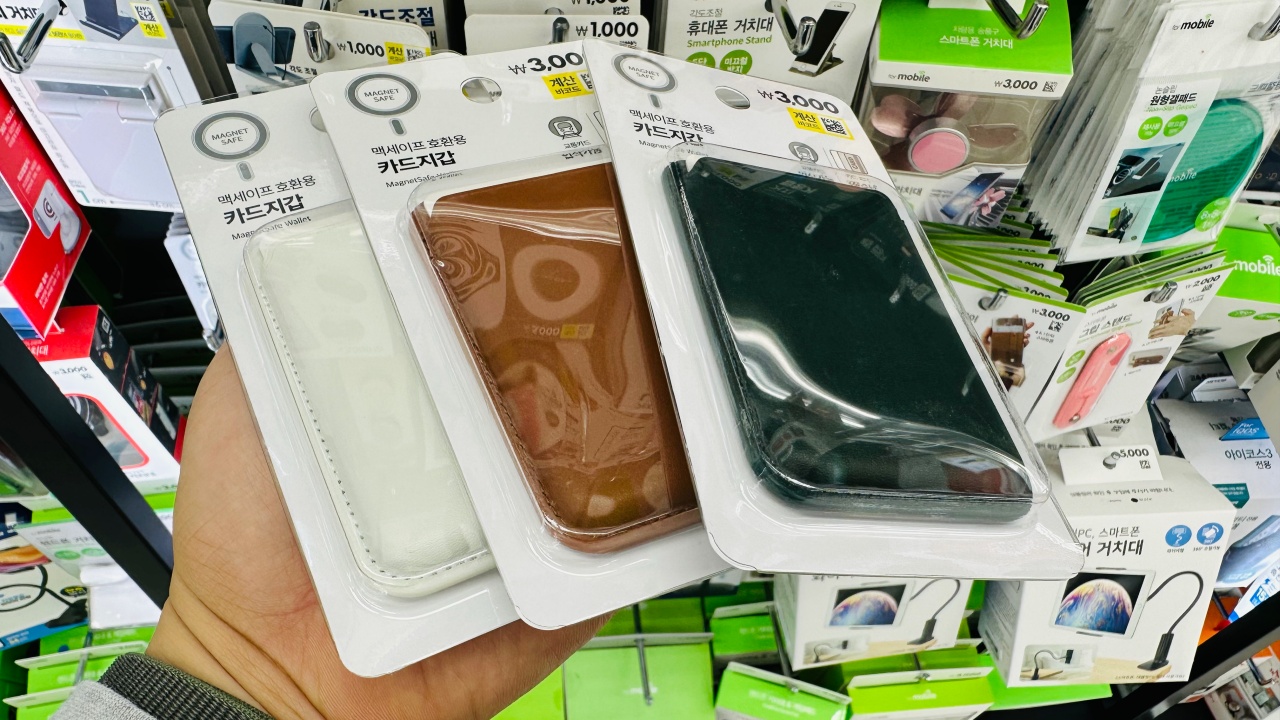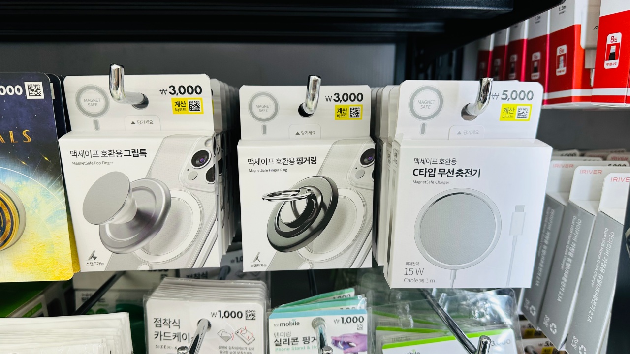 매장마다 재고는 다를 수 있을 것입니다. 잘 찾아보시면 맥세이프 호환용 그립톡, 핑거링, C타입 무선 충전기가 있습니다. 각각 3천원, 3천원, 5천원입니다. 참고로 애플 정품 맥세이프 충전기는 59,000원입니다. 1/10도 안 되는 가격이네요.