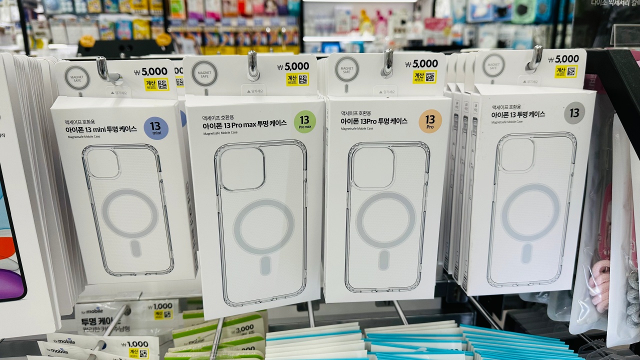 폰 케이스 쪽에 보니 아이폰13 미니, 프로, 프로맥스, 일반 시리즈 맥세이프 호환 케이스도 있습니다. 투명 케이스입니다. 가격은 5천원입니다. 참고로 애플 정품 투명 맥세이프 케이스 가격은 69,000원입니다.