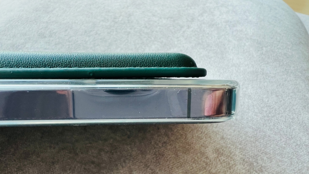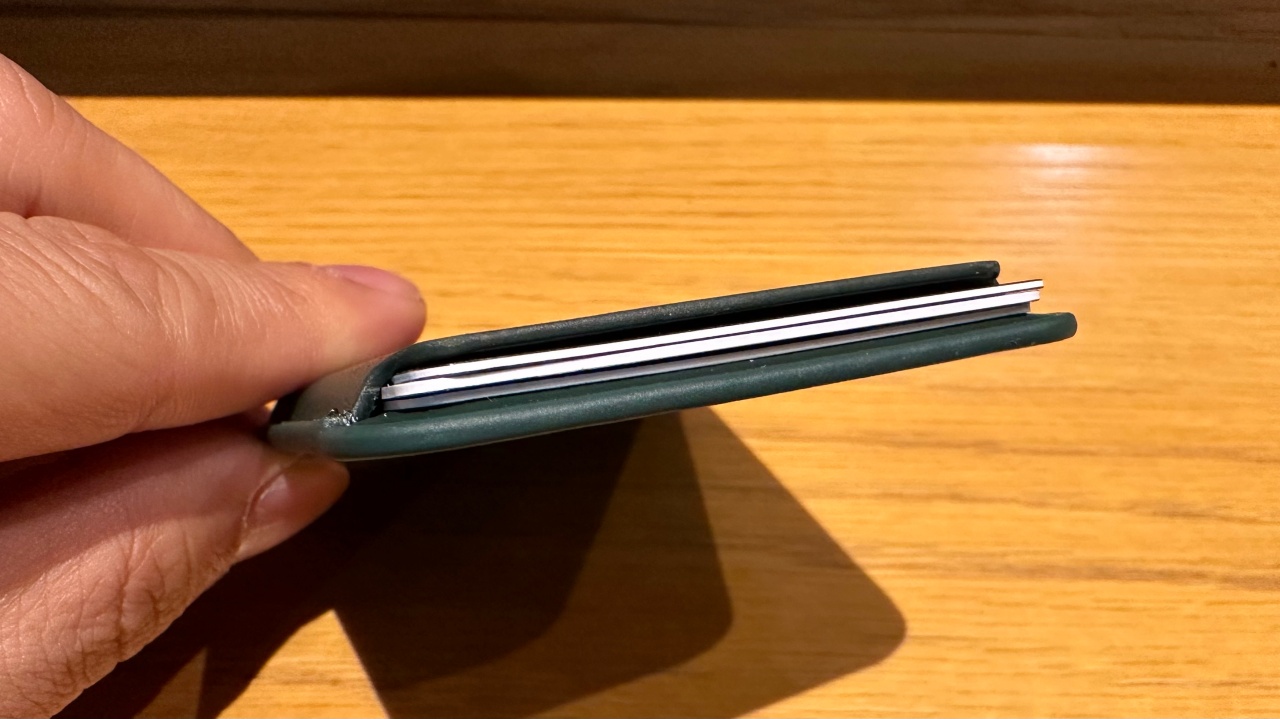 다만, 이렇게 아래 부분이 뜨는 현상이 있었습니다. 그래서 카드지갑을 휘어도 보았지만 완전히 밀착되지는 않았습니다.