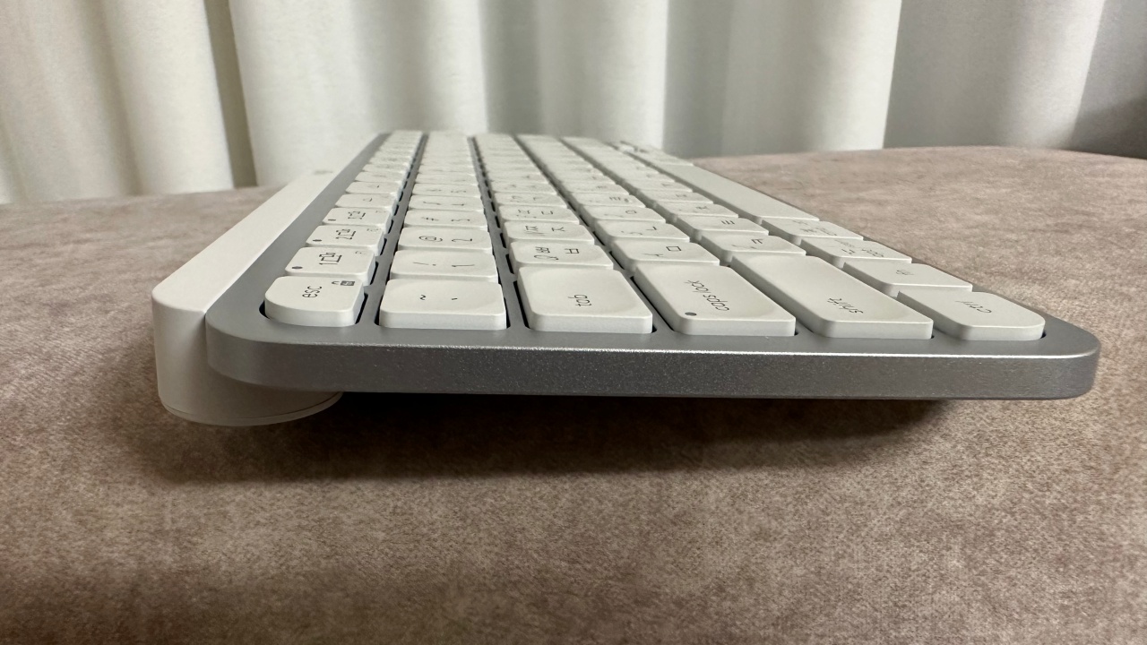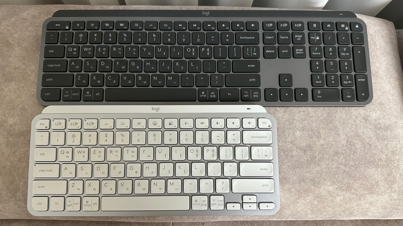 가지고 있는 mx keys와도 비교해 보았습니다. mx keys에 비해 오른쪽 숫자 키패드 부분이 없습니다. 타건감은 뭐 거의 비슷한 것 같습니다.