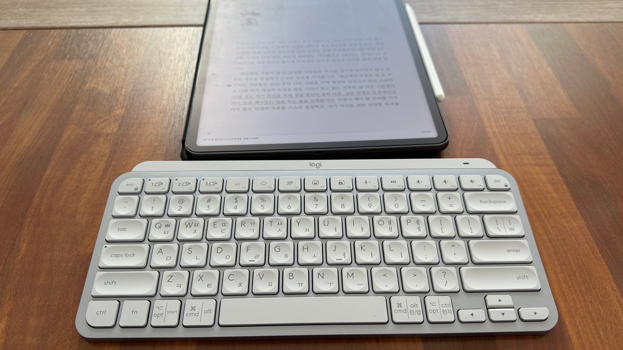 위의 사진이 mx keys가 있는데도 불구하고 mini 버전을 산 이유가 아닐까 합니다. 미니 버전은 이렇게 휴대가 충분히 가능합니다. 도서관에서 아이패드에 연결하여 텍스트 입력이 가능해집니다. 무소음은 아니기에 약간의 소음은 있습니다. 도서관에서는 신경이 쓰일 수 있습니다.