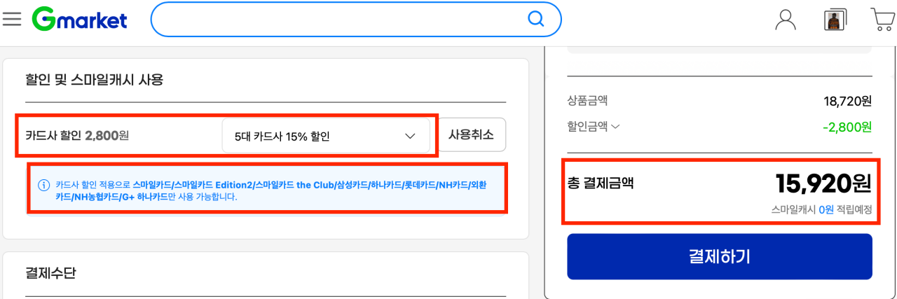 그런데! 위 스샷에서 아래 빨간 네모 부분을 보시면 카드할인 최대 15%라고 나옵니다.