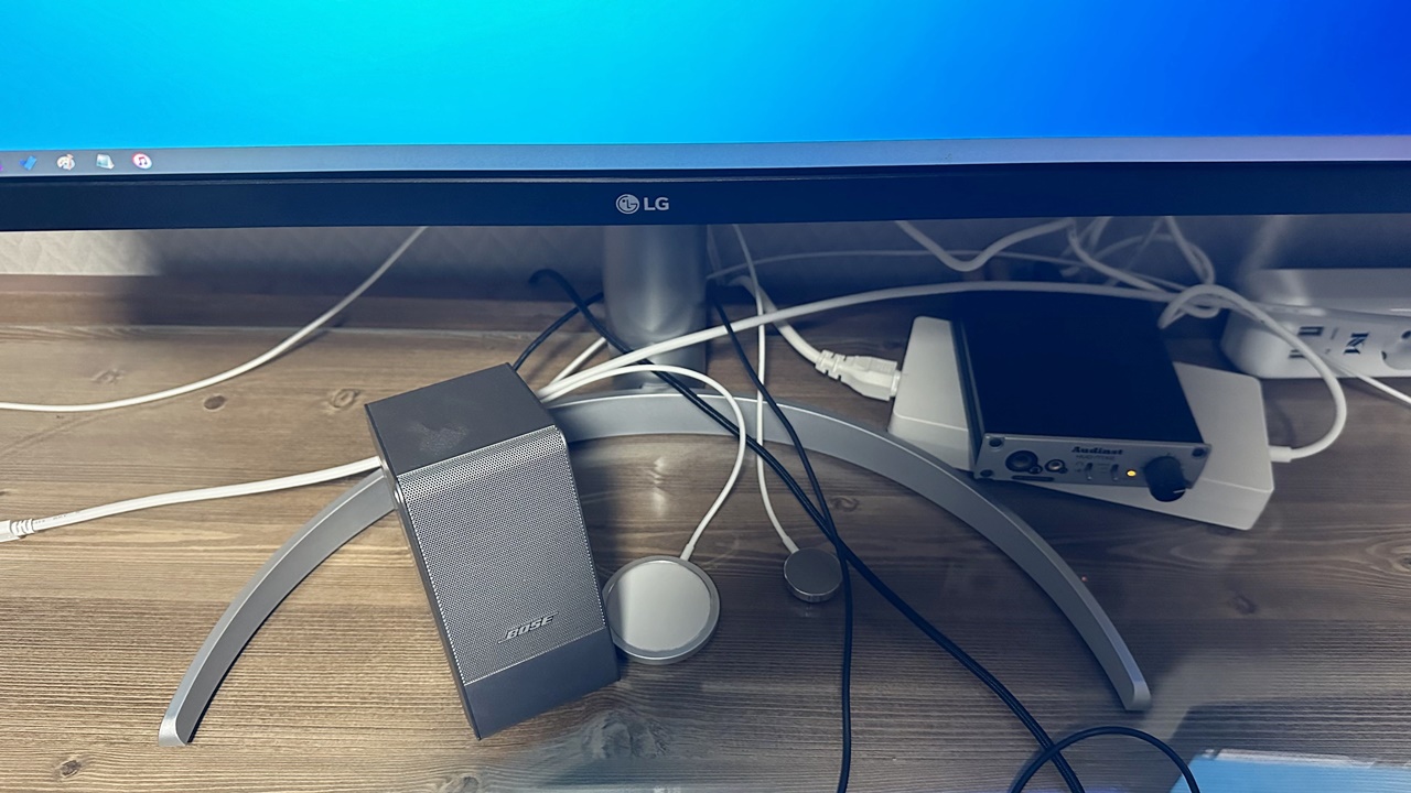 스탠드는 왜 이렇게 만들었는지 모르겠지만 반원 모양으로 되어 있어 쓸데없이 책상의 공간을 차지합니다. 저는 그냥 위의 사진처럼 반원 안쪽 공간에 스피커와 맥세이프, 워치 충전기를 둡니다.