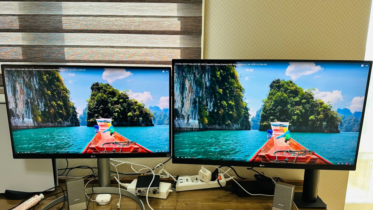 27UP850(왼쪽)과 32UN880(오른쪽)을 비교해보면 사실 화면 자체는 27UP850이 더 나은 것 같습니다. 현재 같은 밝기에서 비교하고 있는데 왼쪽 모니터가 더 색감이 좋은 것 같습니다. 스펙 상으로도 27UP850은 명암비가 1200:1로 32UN880의 1000:1보다 더 좋습니다. 밝기도 400과 350으로 27UP850 쪽이 더 좋습니다. 그러나 27인치의 크기는 화면이 다소 작다고 느끼실 수 있습니다. 32인치의 크기에서 이 정도 색감이면 저는 충분히 만족합니다. 그래서 32UN880을 선택하였습니다.