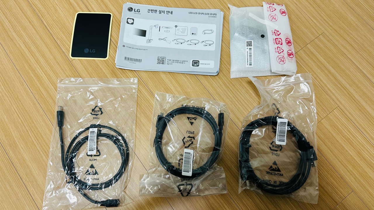 기본 구성품으로는 이렇게 스탠드 나사를 가릴 수 있는 스티커, 제품 설명서, 책상의 케이블 원형 구멍으로 끼워서 고정시키는 장치(?), 전원 연장 케이블 및 전원 어댑터, HDMI 케이블, USB-C 케이블이 제공됩니다. 27UP850 제품에서는 DP 케이블도 기본 제공되는데 32UN880에서는 DP 케이블은 제공하지 않습니다.