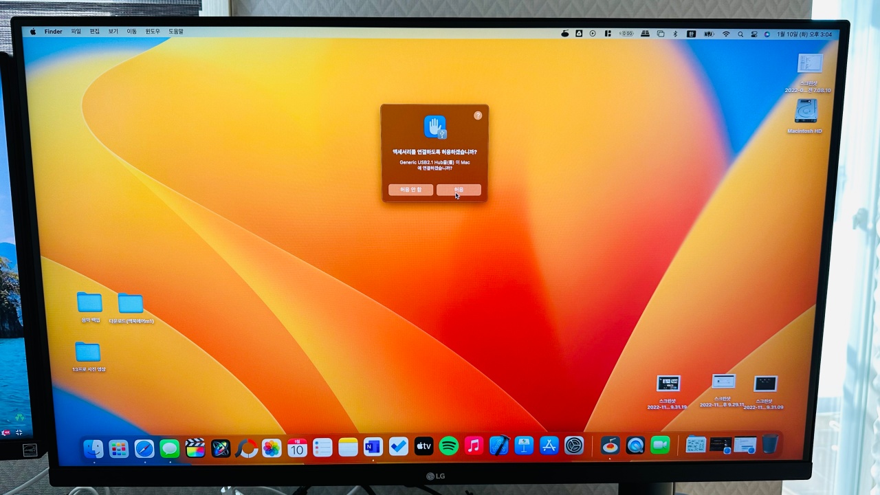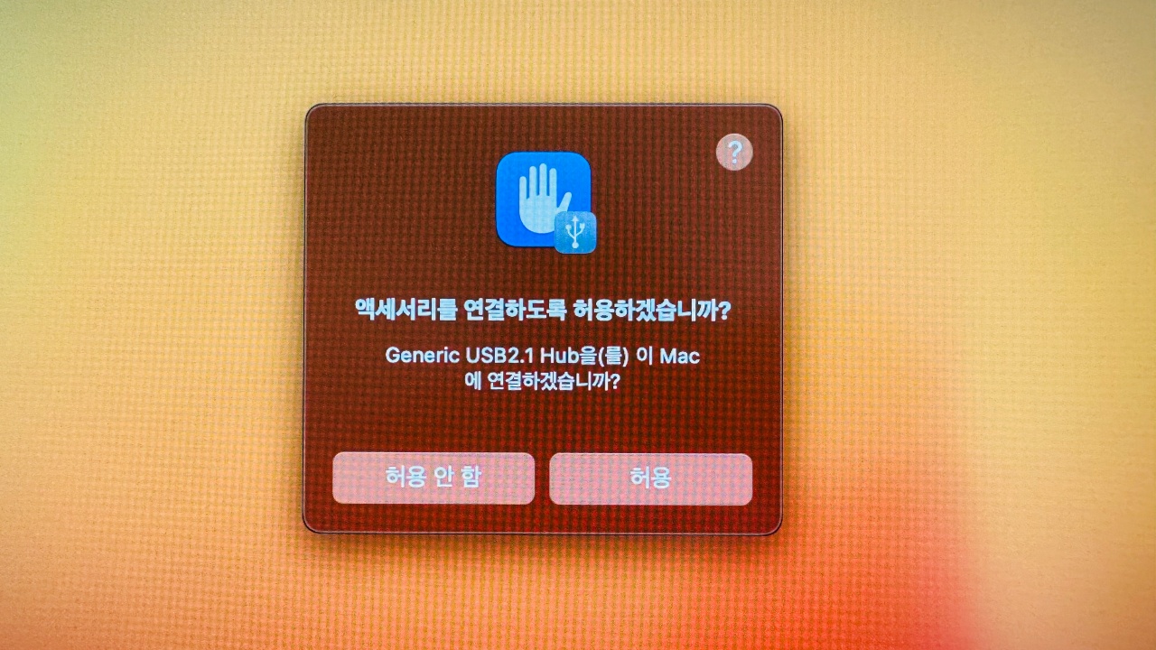 처음 맥북프로에 연결하면 이렇게 '액세서리를 연결하도록 허용하시겠습니가?'라는 문구가 뜹니다. '허용'을 눌러줍니다.