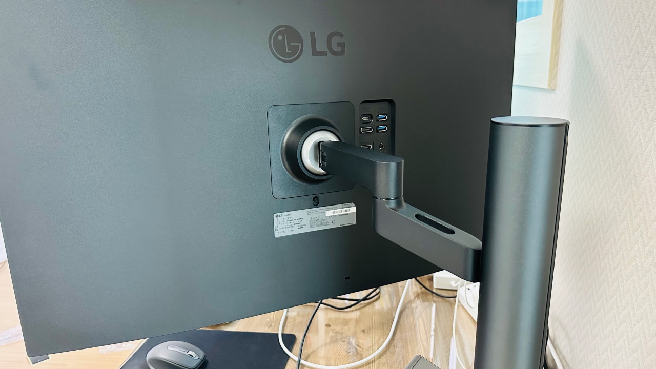 저는 이제껏 모니터암을 따로 사용해 본 적은 없습니다. 일반 스탠드 제품만 사용하다 보니 책상 위의 공간을 차지 하게 되어 시각적으로도 예쁘지 않고, 공간을 상당 부분 차지는 문제가 있었습니다. 32UN880 제품의 경우 모니터에 최적화된 3세대 스탠드 모니터암을 기본으로 제공합니다. 설치도 매우 간단합니다. 책상에 모니터암을 먼저 설치한 후 모니터 본체를 끼우기만 하면 됩니다. 다만, 모니터가 조금 무겁기 때문에 주의를 하기는 해야 합니다.