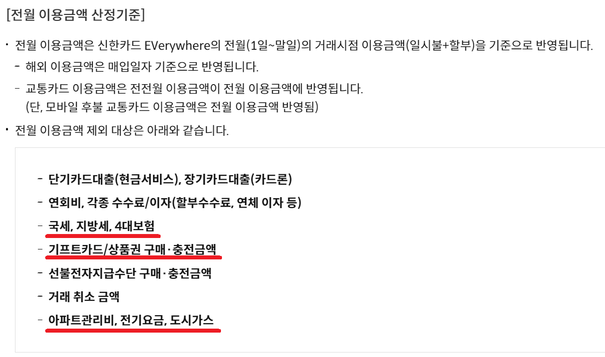 세금, 기프트카드, 상품권 구매, 아파트관리비, 전기요금, 도시가스 요금 등은 카드 이용실적에서 제외됩니다.