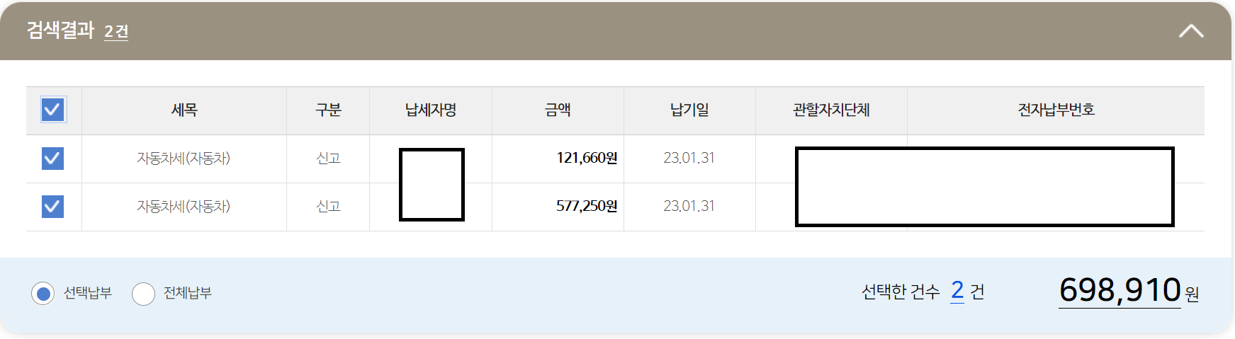 저는 자동차 2대를 운행(1대는 와이프 출퇴근용)하기 때문에 한 꺼번에 자동차세를 납부하였습니다. 할인을 해도 거의 70만원이네요. 자동차 운용에는 비용이 너무 많이 드는 것 같습니다. 자동차세, 주유 또는 충전비, 엔진오일 등 수리비 등...