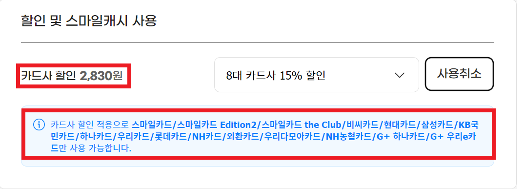 게다가 스마일 카드를 사용하면 최종 카드 결제 가격의 2%를 추가 적립까지 받을 수 있습니다.