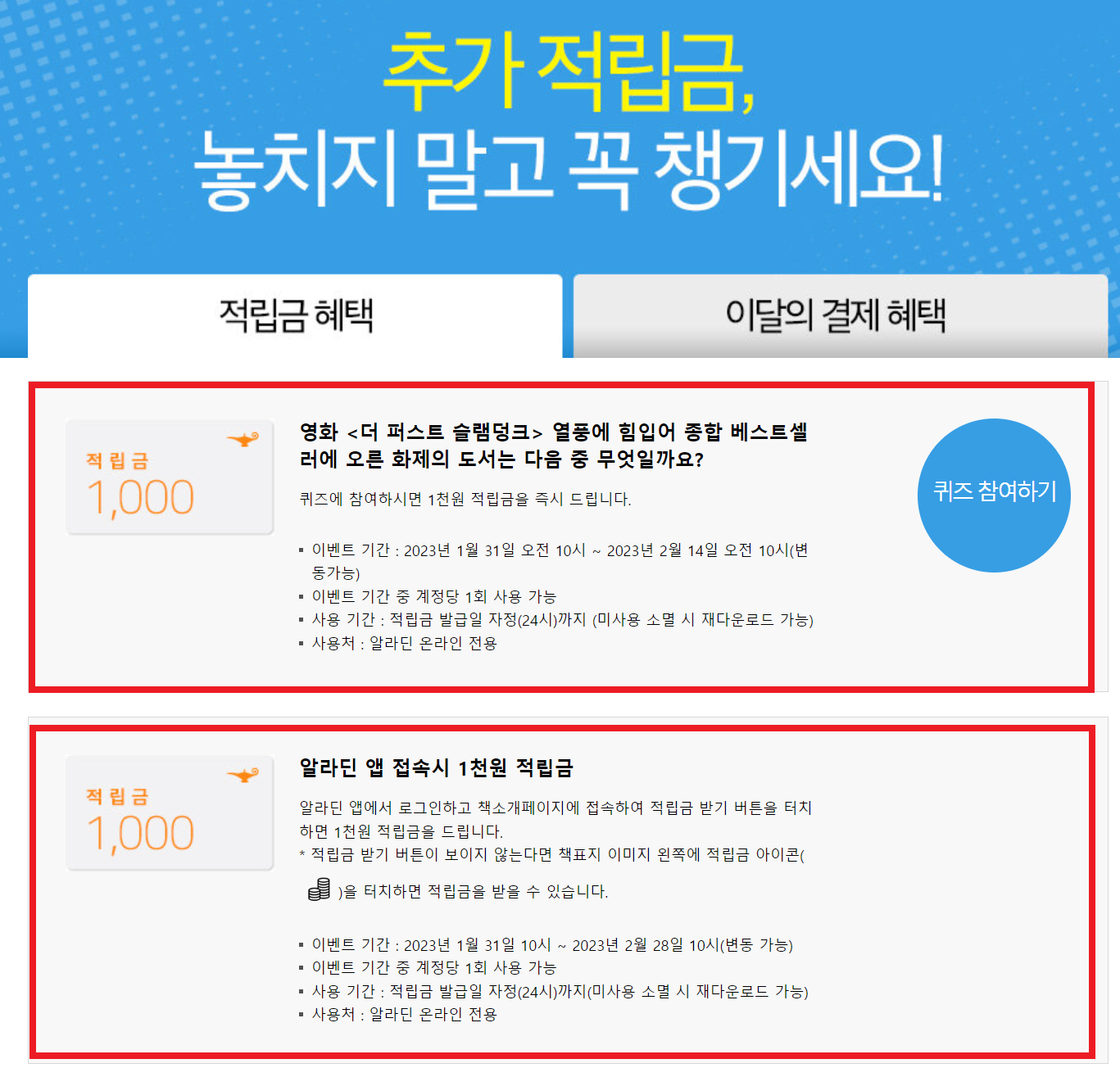 알라딘에서도 예스24와 마찬가지로 매월 2,000원 혜택을 기본 제공합니다.