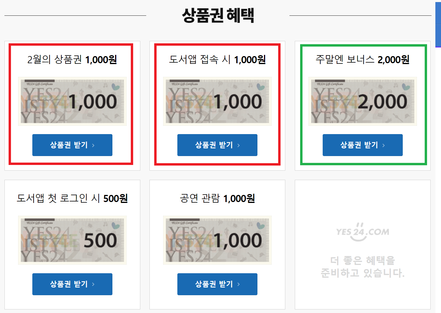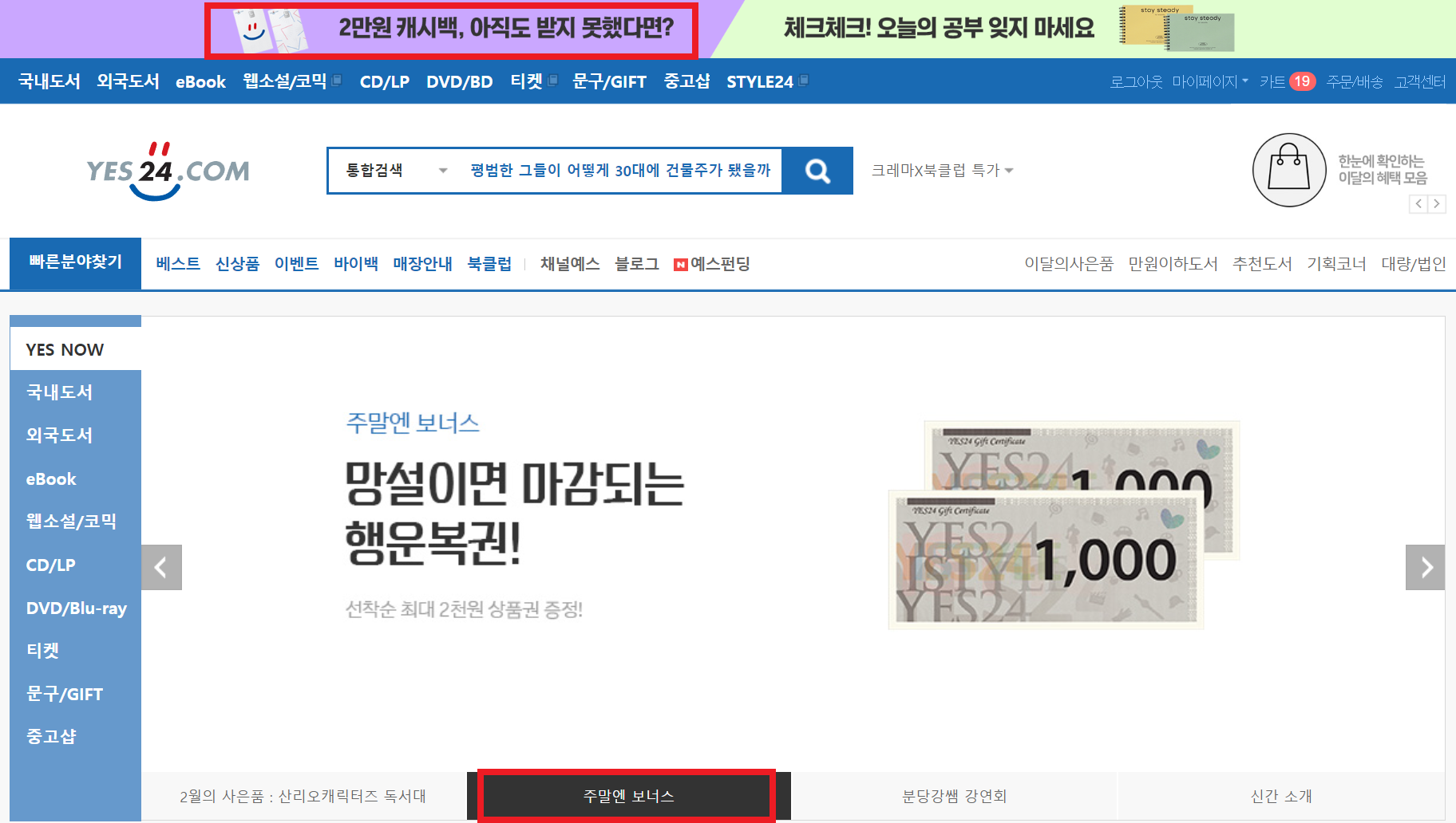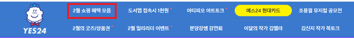 먼저 예스24입니다. 예스24에서는 매월 기본 2천원 할인이 제공되고, 주말마다 선착순으로 1,000원을 할인합니다.