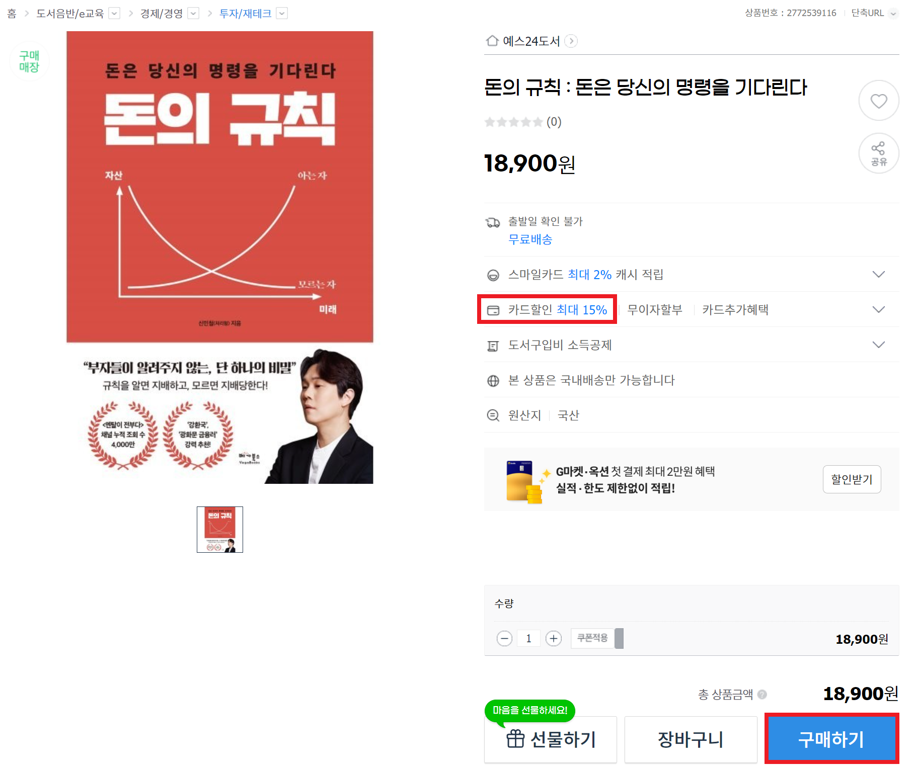 최종적으로 10% 할인 + 15% 카드 할인 혜택을 받을 수 있어 예스24나 알라딘 보다 혜택이 좋습니다.