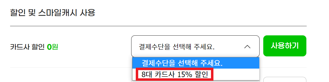 구매하기 버튼을 누른 후 '카드사 할인'에서 '8대 카드사 15% 할인'을 누릅니다.