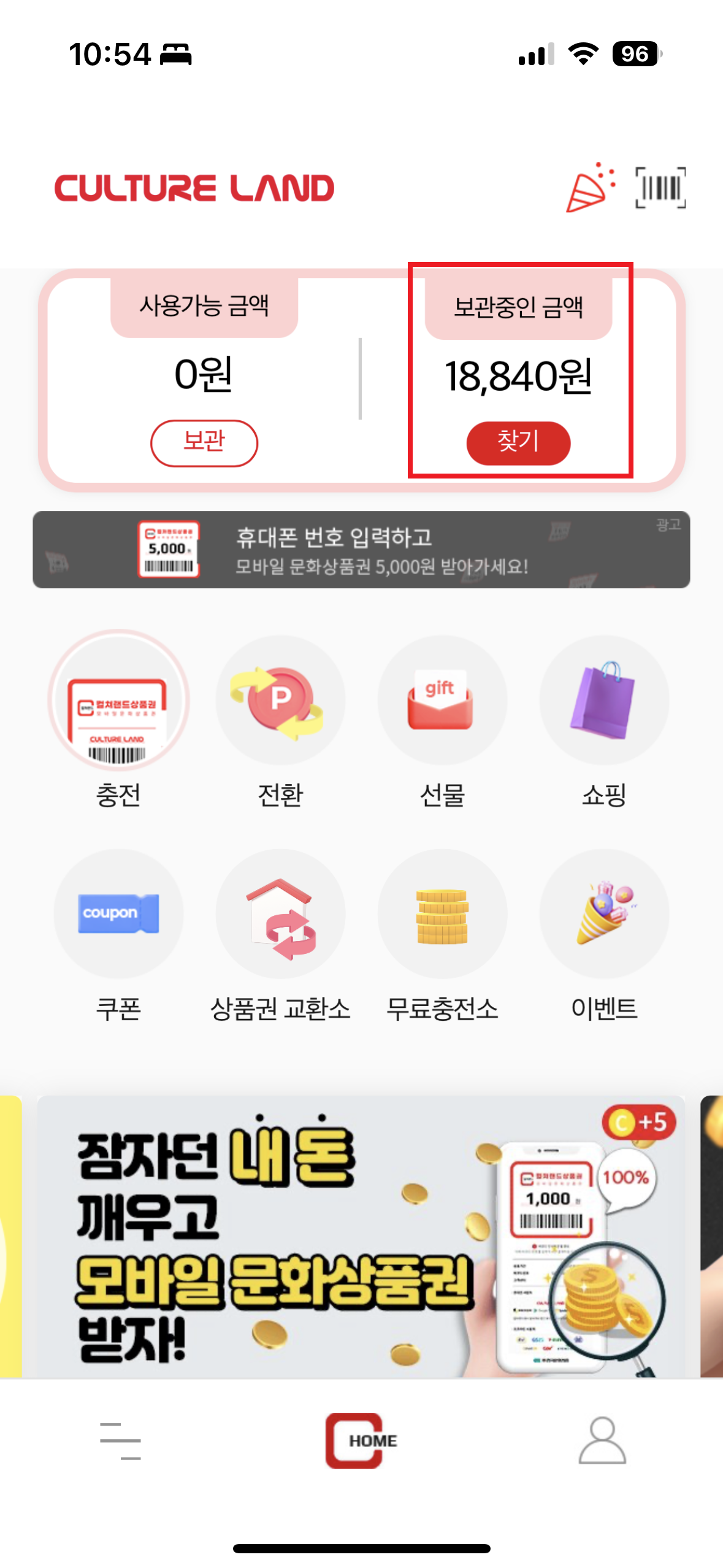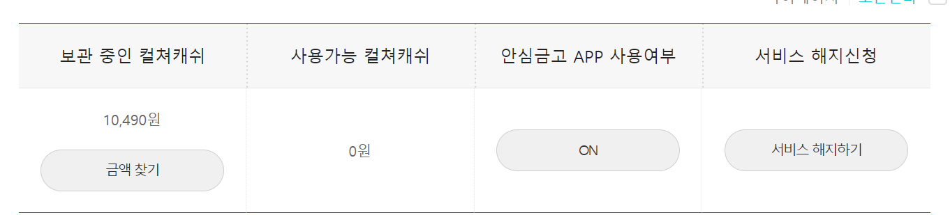 보관 중인 컬쳐캐쉬를 사용하려고 하면 꺼내야 합니다. 아래 스샷에서 '금액찾기'를 누르면 꺼낼 수 있는데요.