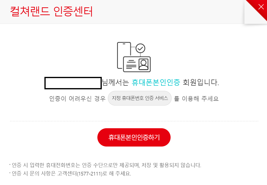1. PC 컬쳐랜드 웹페이지에서 컬쳐캐쉬를 안심금고에서 찾으려면 본인인증을 해야 합니다.