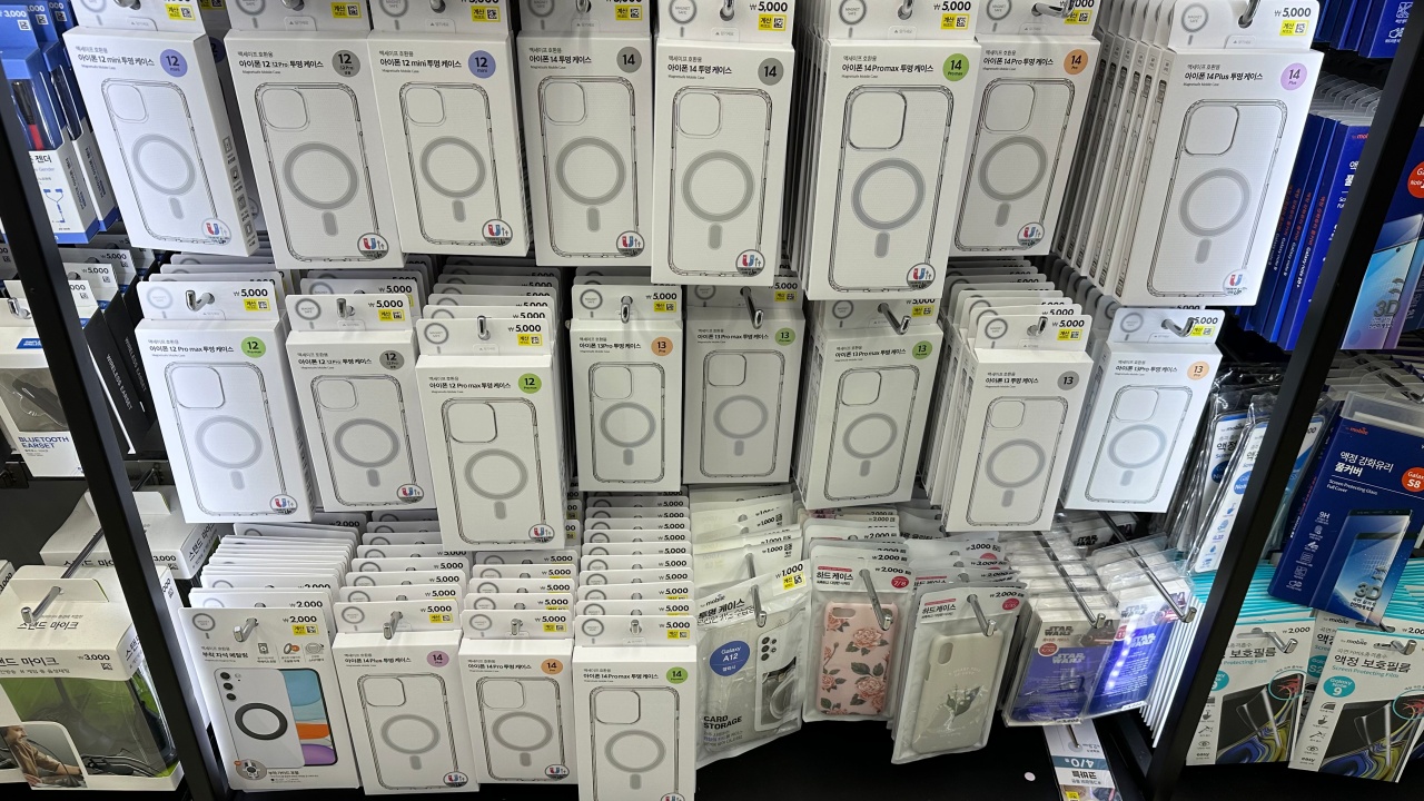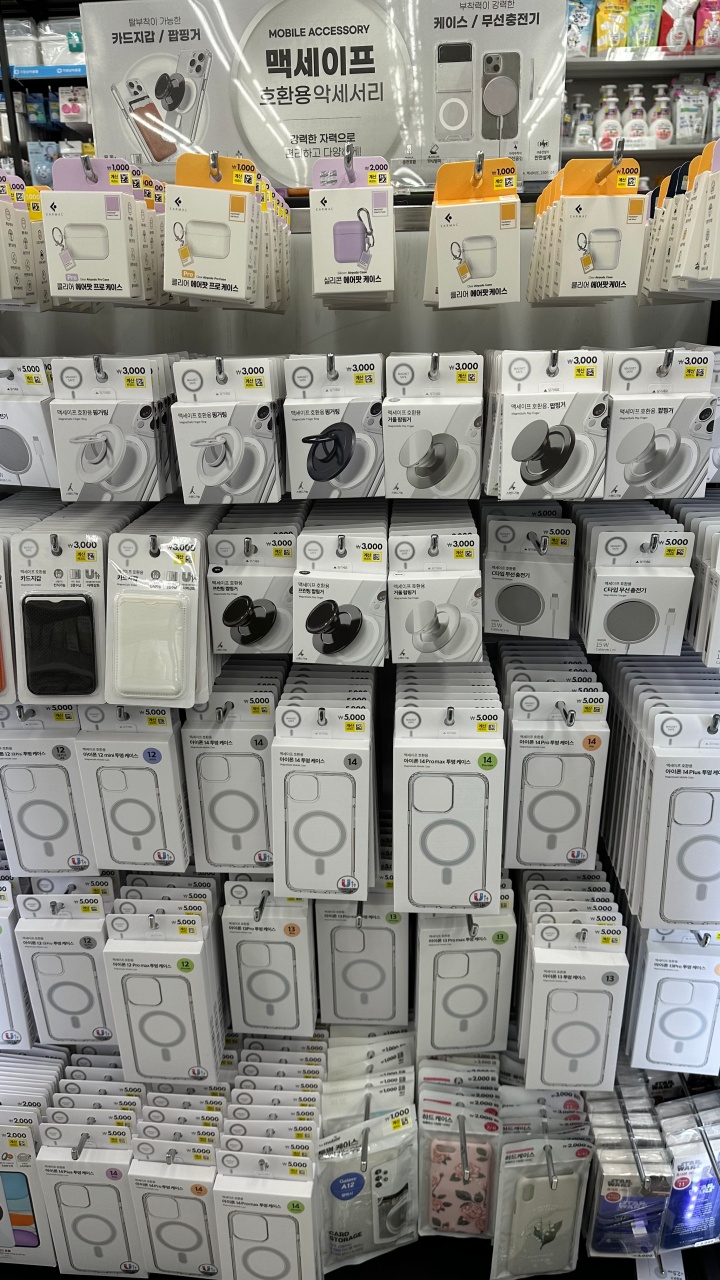 그 아래쪽에는 맥세이프 무선 충전기, 핑거링, 그립톡, 카드지갑을 판매하고 있습니다. 예전에 비해 수량이 엄청 많아졌습니다. 아마 판매가 많이 되었다는 방증이겠죠?