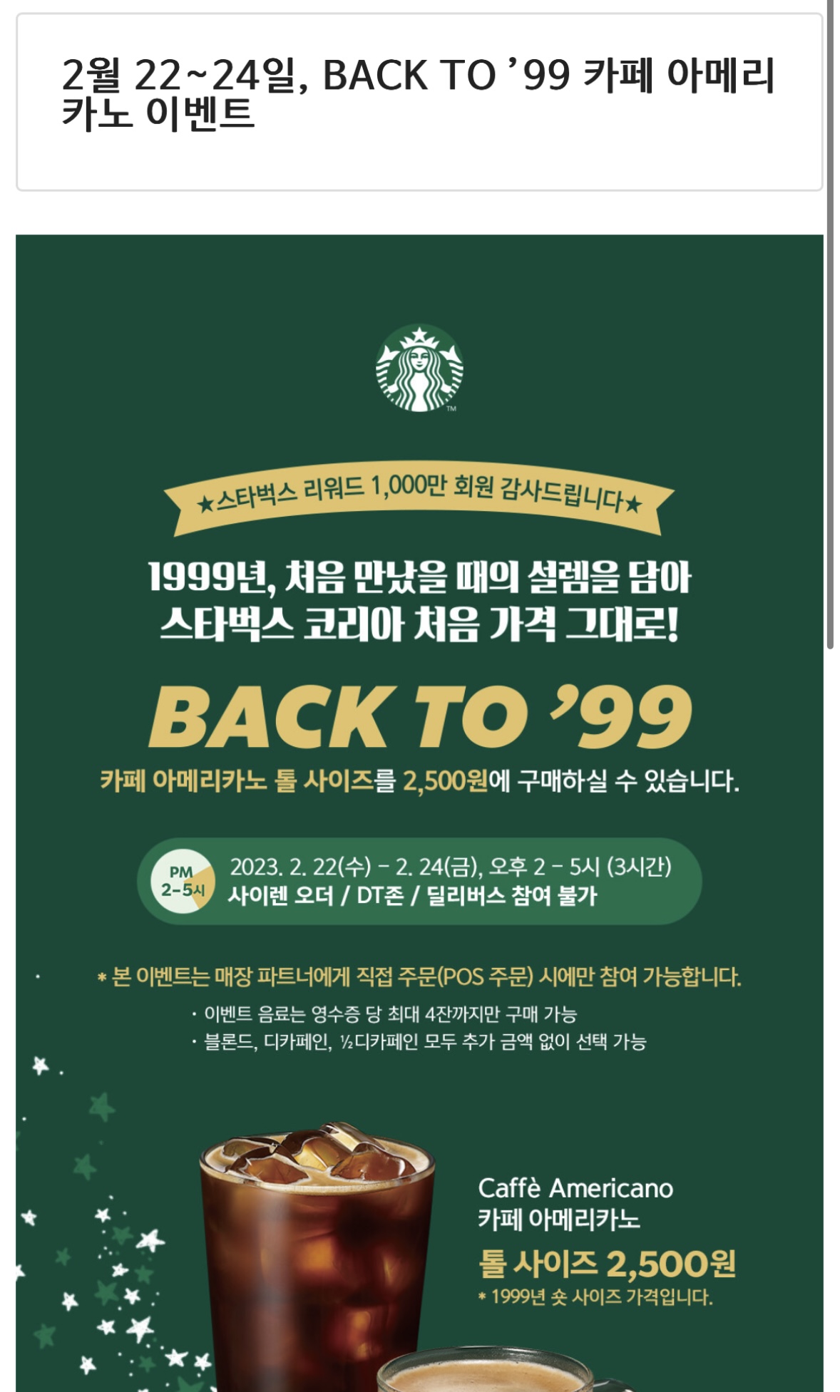 자주 가다보니 이런 이벤트에 민감하게 되더군요. 이번 이벤트는 스타벅스 리워드 1,000만 회원 감사의 의미로 '1999년, 처음 만났을 때의 설렘을 담아 스타벅스 코리아 처음 가격 그대로!'를 키워드로 진행합니다.