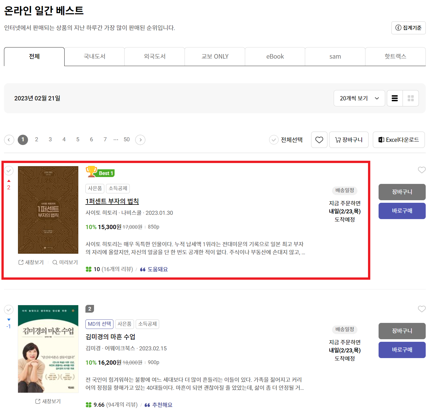 교보문고 사이트에서는 무려 온라인 일간 베스트 1위입니다. 대단하네요. 유튜브의 힘이 대단하다는 것도 알 수 있고, 어떻게 보면 출판 시장의 규모가 작지 않나 생각을 해봅니다. 책을 아주 많은 사람들이 검색하고 구입한다면 유튜버 한 명으로 인해 책이 단숨에 1위까지 찌기기는 쉽지 않을 것이기 때문입니다.