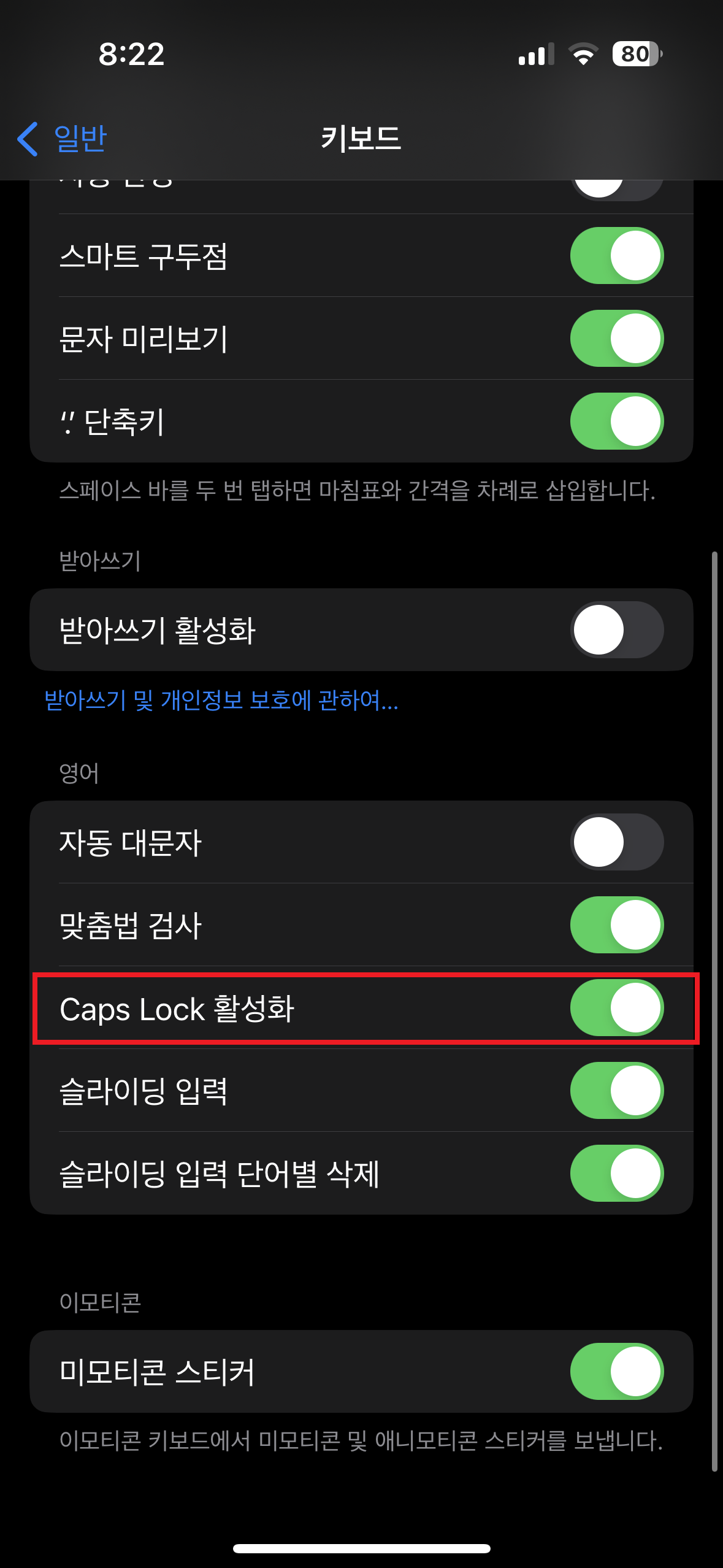3. 쉬프트 2번 눌러도 안 되면, 설정 - 일반 - 키보드 - 'Caps Lock 활성화' 를 체크해준다.